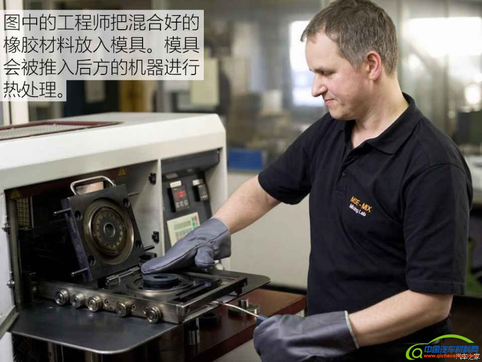 经过调配混合的橡胶材料会经过一个机器加热融化并进行搅拌混合形成黑色较软的混合物。随后,黑色的混合物会经过滚筒压扁形成扁平的片状橡胶。这些片状橡胶经过裁剪处理后,会被放入模具中进行热处理(控制压力和温度,实际上就是进行橡胶硫化处理),最后生成试验部门所需的试验样品规格。