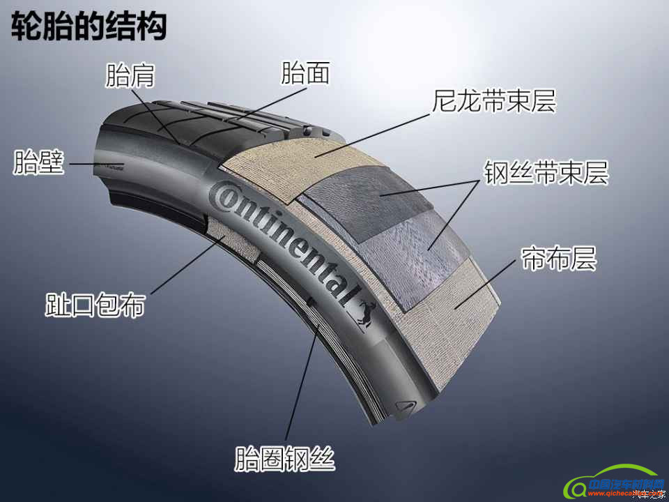 要了解轮胎的研发过程,首先我们要来了解下轮胎的结构。轮胎不完全是橡胶,其内部不同位置分布着胎圈(钢丝)、帘布层以及钢丝带束层等。轮胎上不同位置的橡胶会采用不同的配方。如轮胎内部气密层与胎面就会采用不同的配方,气密层更多的是考虑气密性,而胎面则要考虑耐磨和制动等综合性能。下图为大家展示的是一个普通乘用车轮胎的解剖结构。