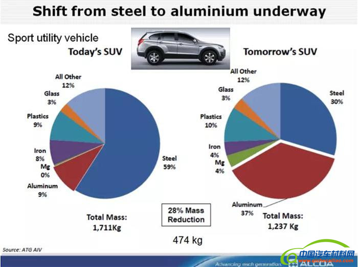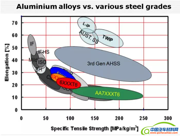 不过有一点是很清楚的,铝材和钢材(包括:先进高强度钢、第三代先进高强度钢及超高强度钢)在未来将共同占据汽车材料的主导地位,复合材料、镁、塑料及其他材质则相对落后,材料的最佳配取决于使用目的与材料本身的特性。综上所述,未来铝材将在大型车(SUV、卡车、皮卡)的用材方面占据主导地位,而先进高强度钢将在小型车用材中占据主导地位。