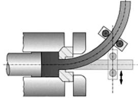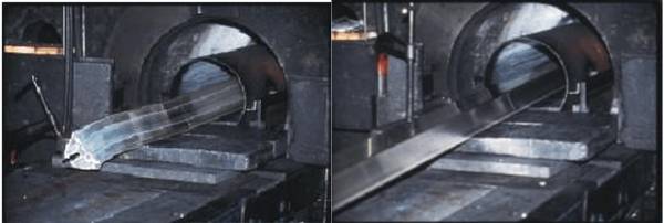 挤压-弯曲一体化加工技术如下图。型材出模口后的弯曲变形是通过一系列引导装置来实现的。该方法不仅可以精确地控制型材的弯曲精度,而且可以简便地实现三维弯曲(即不同部位有不同的弯曲方向和曲率半径)。根据型材弯曲时的受力条件,弯曲引导模离挤压模出口的距离也可以进行调整。