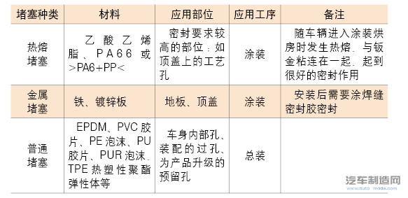 由于车身有系列的工艺孔、装配过孔,需要使用堵塞进行密封,堵塞要求具有良好的防水、防尘、吸音以及隔音性能,堵塞的形式和材料需要根据耐高温、耐老化、耐油、耐溶剂等使用环境以及装饰要求来确定,详见表3。