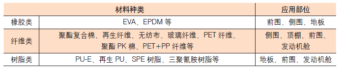 车身与发动机舱连接的部位需重点考虑吸音隔音材料的应用,以隔绝吸收发动机传入车内的噪声,如乘用车前围、货车地板和客车后五人座,使用的吸音隔音材料种类为:主体材料(玻璃纤维、毛毡、PE和PU等)+ 表面材料(无纺布、铝箔和EVA等)。此外,车身内饰如座椅、地毯及内衬等设计时均要考虑其吸隔音性能,以减少外界传入车内的噪声。