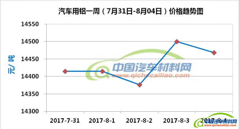 汽车用铝本周内价格变化如下:7月31日-8月2日,价格下跌,跌幅为39元/吨;8月2日-3日,价格快速上涨,1日内涨幅为124元/吨;8月3日-4日,价格稍有回落。车用铝本周均价为14435元/吨,较上周上涨0.27%,较7月份均价上涨1.59%。