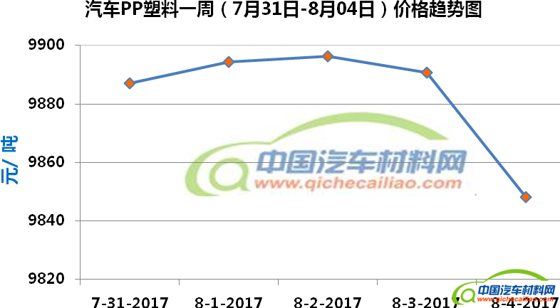 PP塑料本周内价格变化如下:7月31日-8月2日,价格略有上涨,跌幅为9.26元/吨;8月2-3日,价格小幅度下跌;8月3日-4日,价格下跌明显,1天内跌幅为185.19元/吨。车用PP塑料本周均价为9883.33元/吨,较上周上涨0.35%,较7月份均价上涨1.68%。