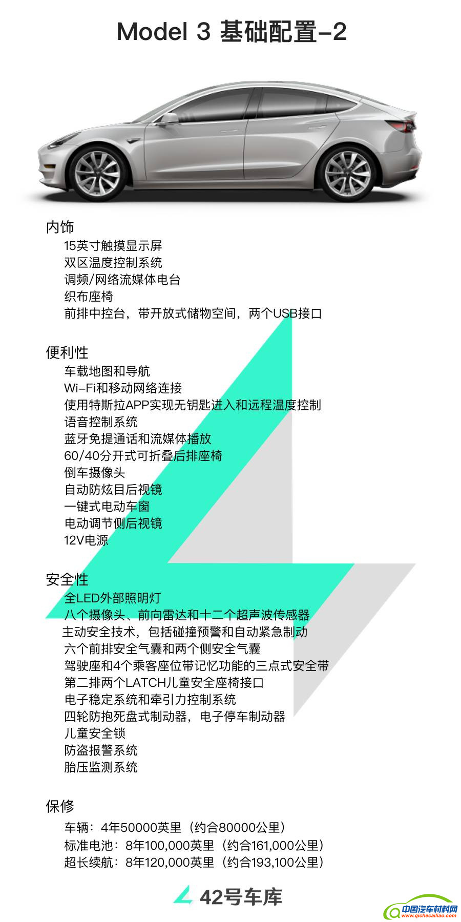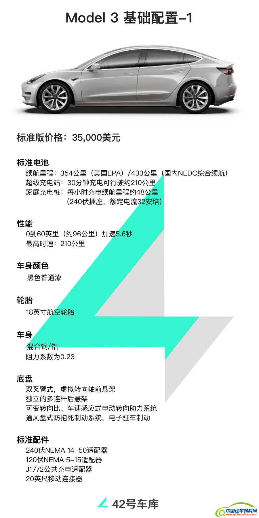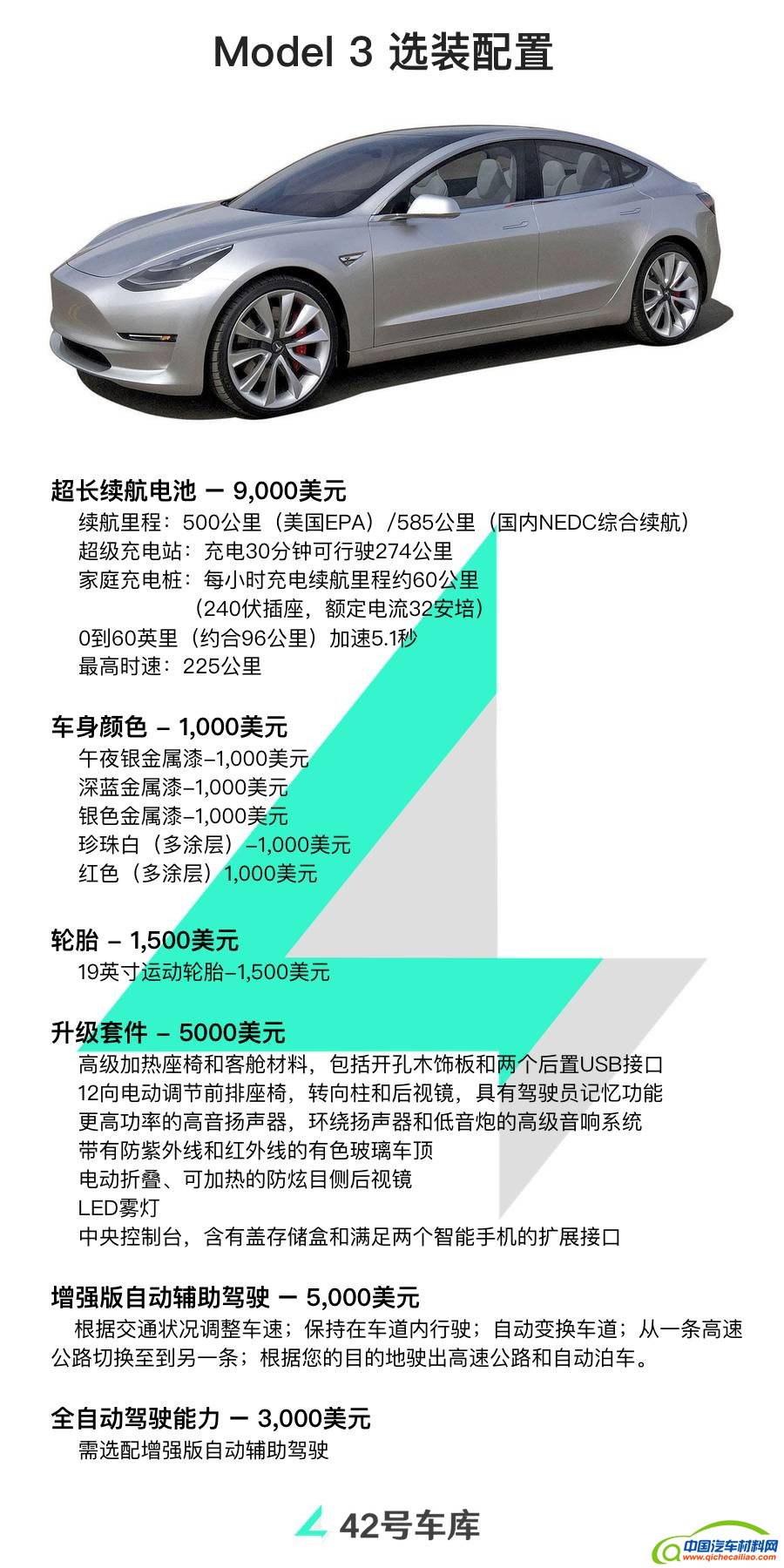 先来看 42 号车库为你翻译的 Model 3 配置表,一共有五张图。