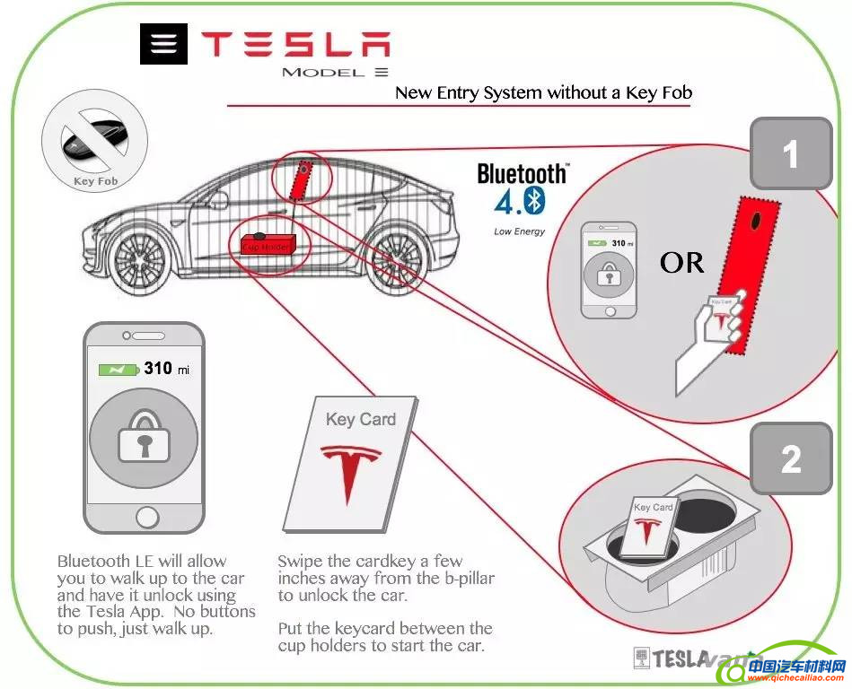 Model 3 弃用了原来的车钥匙,改用 NFC 技术的卡片钥匙,但是在操作的时候,必须在 B 柱的位置进行感应解锁,实现近场通信。进入车辆后,需要把卡片钥匙放在驾驶舱内的杯架来启动车辆。