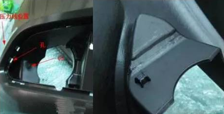 如图所示,保险杠雾灯周围有明显的压力线,影响制品外观和表面质量,由于保险杠属于汽车外表面的部件,对表观质量要求比较严格,产生压力线会对其表观质量产生严重影响。
