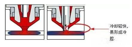 下图是典型的热流道喷嘴的结构,可以看到,其喷嘴前端与模板接触,虽然接触面积有限,喷嘴前端的热量还是会向较冷的模板传导;此外,喷嘴周围由于冷却的需要,有时还存在冷却回路,这样进一步增加喷嘴前端温度过低的可能性。喷嘴前端的温度较低,导致其前端存在少部分冷料,特别是封针封胶不严时,熔体溢出,更易形成冷料,因此热流道喷嘴转冷流道时,建议在冷流道上也设置冷料井。