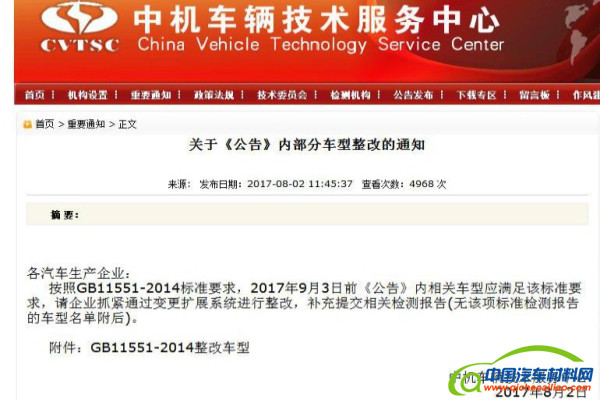 8月2日,中机车辆技术服务中心(简称:中机中心)发布了关于《公告》内相关车型整改的通知指出,2017年9月3日前《公告》内相关车型应满足GB11551-2014《汽车正面碰撞的乘员保护》标准要求,企业应该抓紧通过变更扩展系统进行整改,并补充提交相关检测报告。