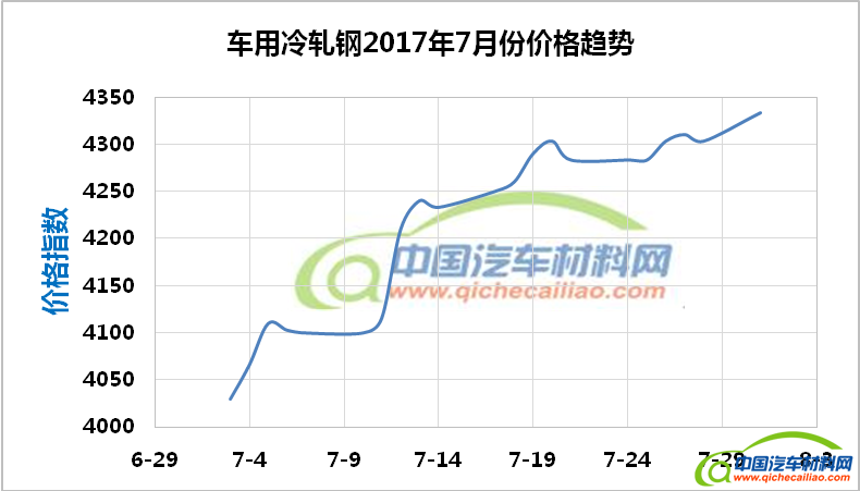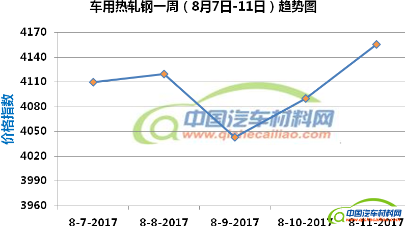热轧钢本周内价格指数变化如下:8月7日-8日,价格指数有约10元/吨的小幅上涨;8月8日-9日,价格指数下跌,1日内跌幅为77;8月9日-11日,价格指数快速回升,11日涨至4156。车用热轧钢本周平均价格指数为4103.8,较上周上涨6.35%,较7月份均值上涨10.37%。