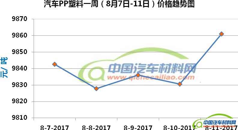 PP塑料本周内价格变化如下:8月7日-8日,价格下跌,跌幅为14.81元/吨;8月8-10日,价格有小幅度波动;8月10日-11日,价格上涨明显,1天内涨幅为30.56元/吨。车用PP塑料本周均价为9839.63元/吨,较上周下跌0.44%,较7月份均价上涨1.23%。