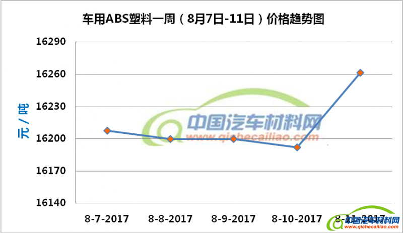 ABS塑料本周价格本周变化如下:8月7日-10日,价格持续小幅下跌,跌幅为15.38元/吨。8月10日-11日,价格大幅上涨,1日内涨幅达69.23元/吨。车用ABS塑料本周均价为16212.31元/吨,较上周下跌0.12%,较7月份均价上涨4.60%。