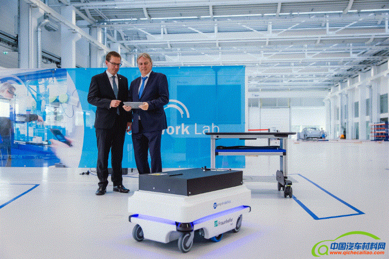 未来的移动工作场合:弗劳恩霍夫技术推广与业务模式副总裁Georg Rosenfeld教授(左)在“弗劳恩霍夫未来工作实验室”向舍弗勒副首席执行官兼首席技术官古兹默教授展示如何让人类成为未来工厂主导者的创新技术。