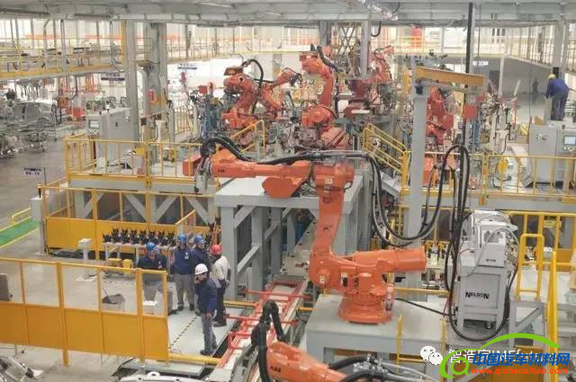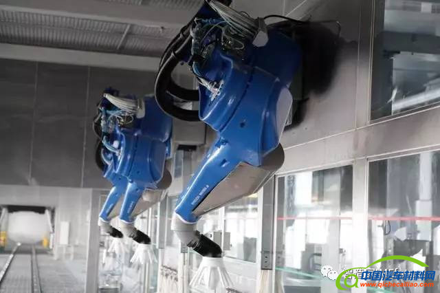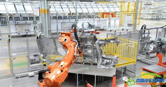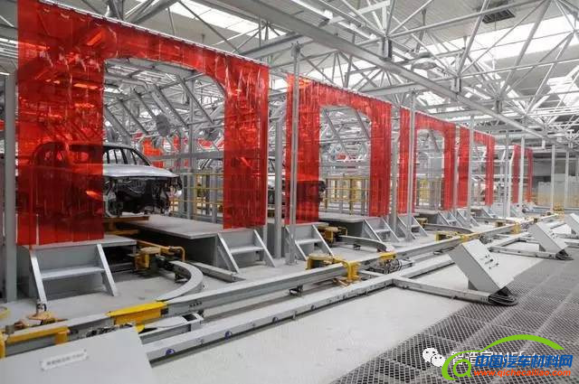 车间还设有车身下部总成线,共有126台机器人,采用了先进的空中buffer将车身机舱、地板总成输送至下部总成线,并由机器人完成涂胶,整个过程的动作都是机器人完成。