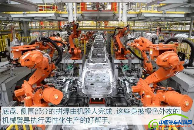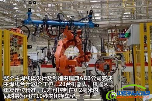 焊装车间具有极高的自动化水平,可以三车型混线生产,整个线体设计及制造由瑞典ABB公司完成,主焊线合计20个工位、23台机器人,其中总拼工位采用ABB特有的framer形式,实现左/右侧围总成夹具、地板总成定位夹具和顶盖总成定位夹具四大部分合拼,机器人重复定位精准,可控制在0.2毫米内,10秒切换车型,效率较高。