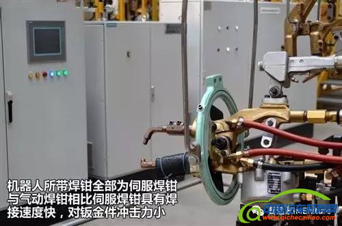 焊装机器人所带焊钳全部为伺服焊钳,与气动焊钳相比伺服焊钳具有焊接速度快,对钣金件冲击力下等特点,同时整套设备可以监控焊钳的磨损,以提示以提高效率减少错误。