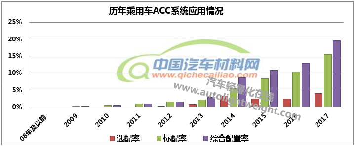 以无人驾驶和ACC系统为代表的汽车智能化技术不断发展,给驾驶者带来的轻松舒适的驾乘感受逐渐被消费者接受。乘用车ACC系统的应用比例逐年上升。ACC系统综合配置率从09年的0.19%上升到17年的19.53%。2016年上市乘用车中ACC系统的综合配置率达到了12.84%,其中标配率为10.45%。