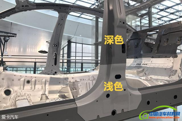 整个B柱虽然采用了同一种材料,但是我们可以明显看到上下分为深色和浅色。这是因为B柱上下部分冷却温度和冷却时长不同。深色部分强度更高一些,浅色部分强度稍弱。