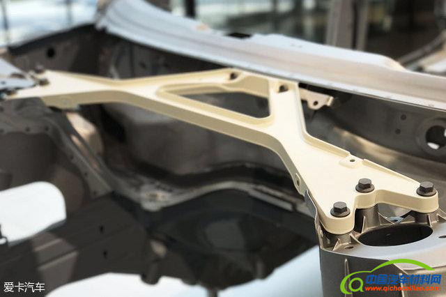 发动机舱支架采用了铸镁合金材质,刚度性能出色,密度相比现款A8的铝制部件降低45%,重量减轻28%,减重大概500g左右。塔顶位置采用了铸造铝合金,厚度比较薄,但是强度完全满足要求。