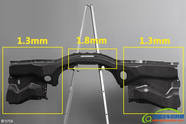 整个前防火墙其实是由三块不同厚度的热成型超高强度钢焊接在一起的,其中两侧钢板厚度为1.3mm,中间钢板厚度为1.8mm,这样可以在保障安全性的同时降低防火墙重量。