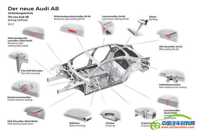 新一代奥迪A8车身的连接方式达到了14种,其中包括MIG焊、远程激光焊等8种热连接技术和冲铆连接、卷边连接等6种冷连接技术。