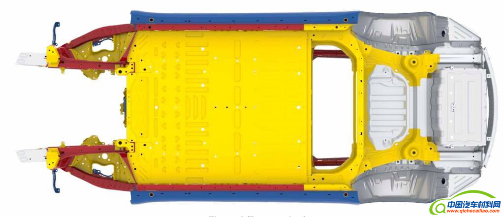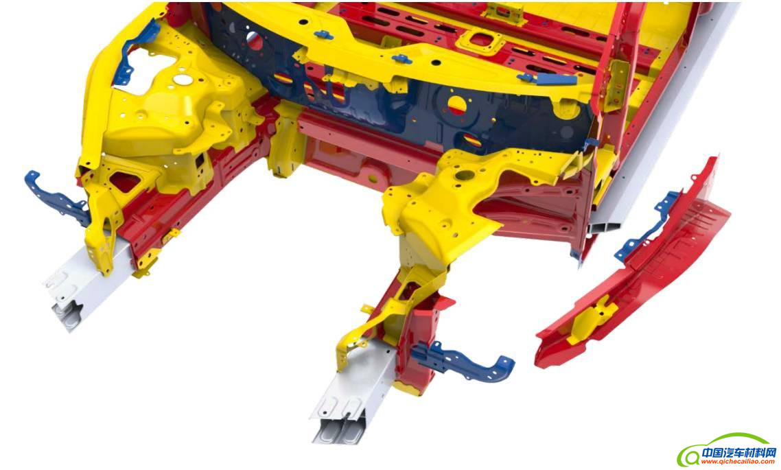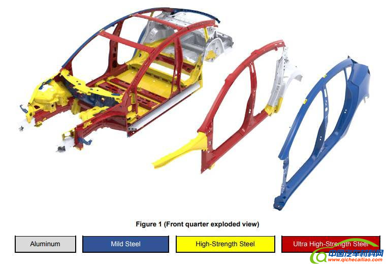 维修指南显示,Model 3 白车身主要由四种材料组成:铝材(灰)、低碳钢(蓝)、高强度钢(黄)、超高强度钢(红)。