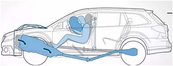 发动机是提供汽车动力的重要零部件,但其在发生事故时很可能成为安全隐患。在汽车受到前方碰撞时,前置发动机很容易被迫后移,挤压驾驶室,使得生存空间减小,从而给驾乘人员造成伤害。