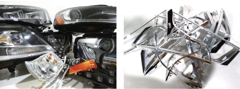 因为车灯与安全密切相关,故所有生产步骤均通过常规质量控制加以监测,存在缺陷的产品会被直接分离出来。在所调查的两家欧洲车灯制造商所属工厂中,每年会因此带来包含复合车灯模块和单一塑料组件的1100吨混合废物(图1)。即使利用最先进的技术,也无法从车灯回收足够纯净的塑料。其中包含大量深色塑料材料,无法通过传统的光谱分类方法进行分离。金属化的反射镜、装饰线以及带有特殊硬化和UV涂层的漫射盘,也对单一成分碎片分拣并实现现有材料潜在价值带来极大的困难。由于缺乏合适的回收方法,故只能通过昂贵的热处理方式来利用这些混合生产废料。