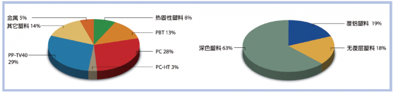 图3 车灯组成(重量百分比)实例,以及对混合碎片(左)和纯塑料碎片(右)的差异化检查(来源:Fraunhofer IVV)