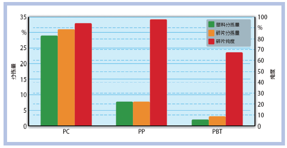 机械分解后,塑料的直接分类已非易事。然而,对几种车灯进行的人工分析结果表明,其中含有约50%的深色塑料和20%的金属化塑料。这符合制造商使用PC、PBT、PP-TV40作为主要塑料的期望。但由于车灯型号的变化以及相关装配件的差异,在随后的回收过程中必须考虑各单一成分质量分布的持续变化。