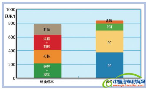 图8 按年废料量2000 t/a进行汽车车灯回收过程研发经济效益计算(来源:Fraunhofer IVV)