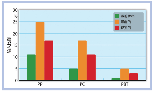 图7 纯塑料碎片潜力分析(16.5% 的金属在此未加考虑)。通过优化材料分解将效率提高80%也被当作实际的景象(来源:Fraunhofer IVV)