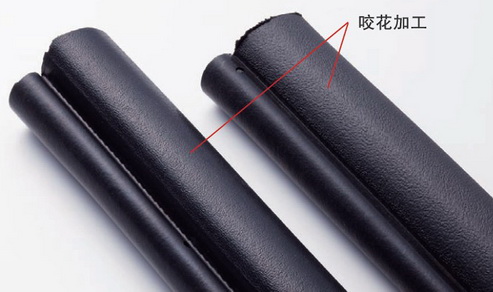 老式车门嵌缝条需要在能从车内看到的硬橡胶部分,通过其他工序粘贴经过咬花加工或着色的烯烃类热可塑性弹性材料(TPO)。而轻量车门嵌缝条不再粘贴TPO,直接在硬橡胶上实施了咬花加工(图5)。橡胶具有弹力,因此此前难以直接形成褶皱,而此次通过改进转印辊形状和压力施加方法做到了这一点。