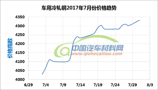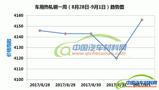 热轧钢本周内价格指数变化如下:8月28日-31日,价格指数下跌,跌幅为26;8月31日-9月1日,价格指数回升,1日内涨幅达36。车用热轧钢本周平均价格指数为4141.6,较上周下跌0.03%;较7月份均价上涨11.38%。