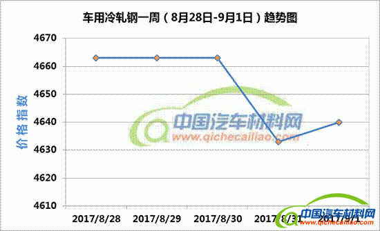 冷轧钢本周价格变化如下:8月28日-31日,价格指数下跌,跌幅为30;8月31日-9月1日,价格指数略有回升,9月1日价格指数为4640。车用冷轧钢本周平均价格指数为4657.25,较上周下跌0.14%,较7月份均价上涨10.50%。