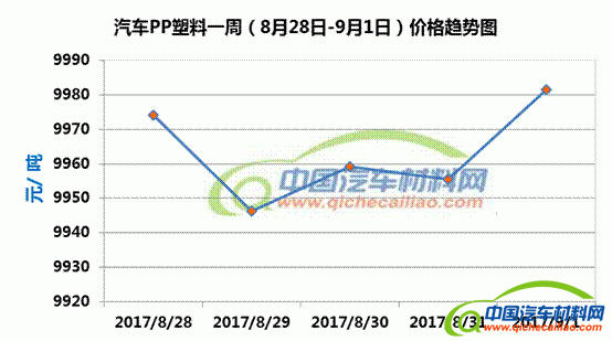 PP塑料本周内价格变化如下:8月28日-29日,价格下跌,跌幅为27.78元/吨;8月29-31日,价格有小幅度波动;8月31日-9月1日,价格上涨,涨幅为25.93元/吨。车用PP塑料本周均价为9963.33元/吨,较上周上涨0.49%,较7月份均价上涨2.50%。