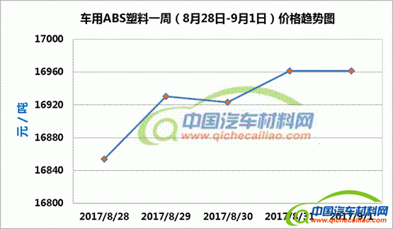 ABS塑料本周价格整体呈上涨趋势,一周内涨幅为107.69元/吨,本周五价格涨至16961.54元/吨。车用ABS塑料本周均价为16926.15元/吨,较上周上涨2.05%,较7月份均价上涨9.21%。