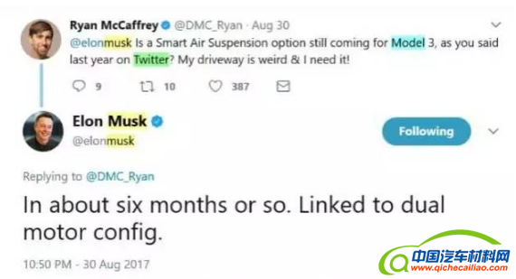 有人在Twitter上问马斯克,特斯拉Model 3是否仍然像他去年说的那样,推出智能空气悬挂版本。马斯克回应称,这将在约6个月后推出,届时特斯拉将同时提供双发动机、全轮驱动的配置。