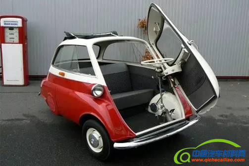 【前开式车门】 前开式车门设计中最经典的车型要数宝马Isetta(伊塞塔)。Isetta最初是由一家名为Isomoto的意大利公司设计并制造,后来宝马公司购买了Isetta的知识产权、设计图纸和全套生产所需的模具。 这款经济性小车外形圆润,仿佛是一颗被装在车轮上的鸡蛋,因此也被人们称为“泡泡车”。整辆车仅有一扇被安装在车头、和方向盘连接在一起的车门。车门从车头的正前方拉开,方向盘也会相应位移一定的距离,这样的车门设计让驾乘者的上下车过程变得非常方便。 上世纪50年代到1962年年底停产时,Isetta共售出16万辆,成为宝马公司当时卖得最好的汽车,为二战后宝马振兴自己的汽车产业做出了不可磨灭的贡献。