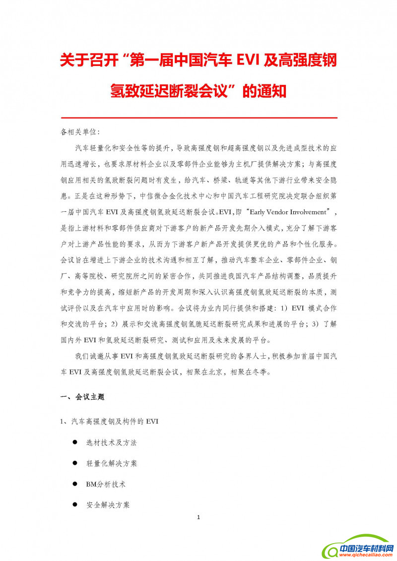 关于召开“第一届中国汽车EVI及高强度钢氢致延迟断裂会议”的通知