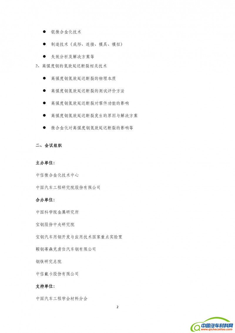 企业能够为主机厂提供解决方案;与高强度钢应用相关的氢致断裂问题时有发生,给汽车、桥梁、轨道等其他下游行业带来安全隐患。正是在这种形势下,中信微合金化技术中心和中国汽车工程研究院决定联合组织第一届中国汽车EVI及高强度钢氢致延迟断裂会议。EVI,即“Early Vendor Involvement”,是指上游材料和零部件供应商对下游客户的新产品开发先期介入模式,充分了解下游客户对上游产品性能的要求,从而为下游客户新产品开发提供更优的产品和个性化服务。会议旨在增进上下游企业的技术沟通和相互了解,推动汽车整车企业、零部件企业、钢厂、高等院校、研究院所之间的紧密合作,共同推进我国汽车产品结构调整,品质提升和竞争力的提高,缩短新产品的开发周期和深入认识高强度钢氢致延迟断裂的本质,测试评价以及在汽车中应用时的影响。