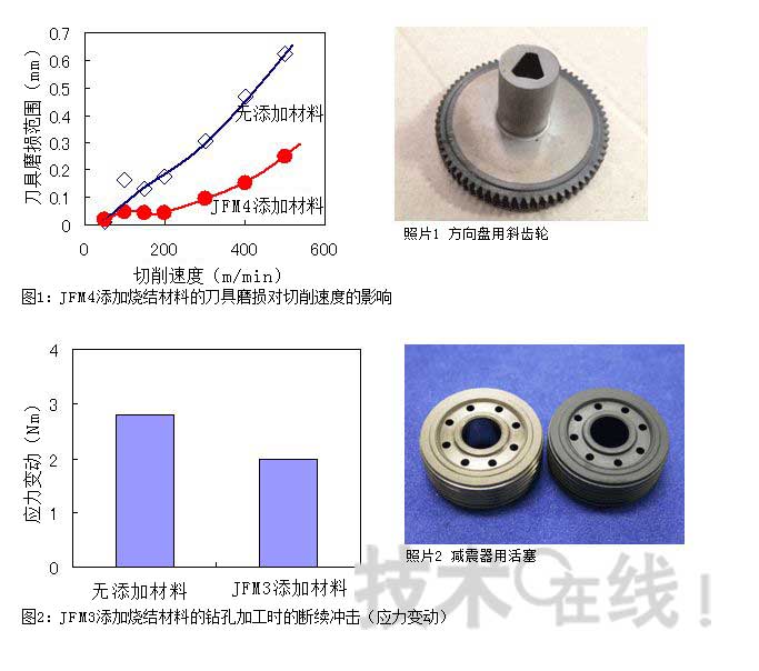 切削加工时的摩擦热会使JFM4的部分成分软化,在刀具表面形成润滑膜,从而减少刀具与烧结材料之间的摩擦。能够在高速切削加工时发挥功效。添加JFM4除了能使刀具寿命延长至以往约4倍之外,还可将原为200~300m/分钟的切削加工进给速度提高至500m/分(图1)。此次,这种添加了JFM4的铁粉烧结材料首次被用于量产部件,被韩国Halla Stackpole公司采用作为制造方向盘用斜齿轮的烧结材料。