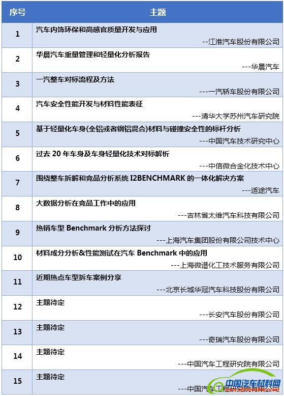 为了进一步加强汽车行业Benchmark技术和方法的交流,使得相关BM数据平台在汽车正向设计和性能开发中发挥更大作用,支持汽车产品的定义。中国汽车材料网、中信微合金化技术中心、中国汽车工程研究院有限公司拟于2017年11月30日-12月1日举办“2017(第二届)汽车benchmark分析及汽车性能开发技术研讨会”,希望促进行业的BM数据库建设、推动轻量化新材料、新工艺、新技术的应用,进而推动汽车正向设计和性能开发。
