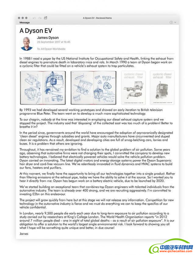 为了推进这一项目顺利的展开,戴森投入了20亿英镑的资金,其中一半将拥有汽车研发,另一半用于电池设计。眼下,这款车还是公司的最高机密,公司创始人詹姆斯·戴森希望这一状态继续保持下去。为此,戴森专门发邮件告诉职工,由于现在汽车行业的新技术竞争异常激烈,所以他们必须要竭尽所能保持汽车项目的机密性。