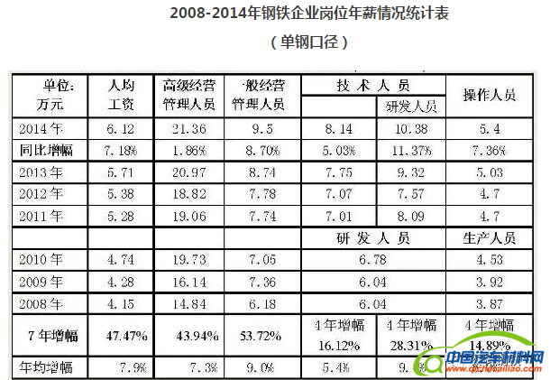 2008-2014年钢铁企业岗位年薪情况统计表