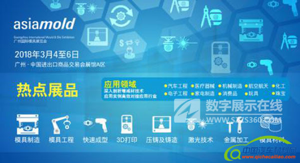 第十二届广州国际模具展览会(Asiamold)将于2018年3月4至6日于广州中国进出口商品交易会展馆隆重举行。展会致力呈现3D打印、金属加工、模具的自动化技术、产品及方案。为期三天的Asiamold将再次与SIAF广州国际工业自动化技术及装备展览会同期举行,预期两展迎来超过850家参展商,总展览面积超过55,000平方米,覆盖五个展馆,吸引超过65,000位来自世界各地的专业买家进场,观众业务性质包括制造商、产品供应商、分销商和终端用户。