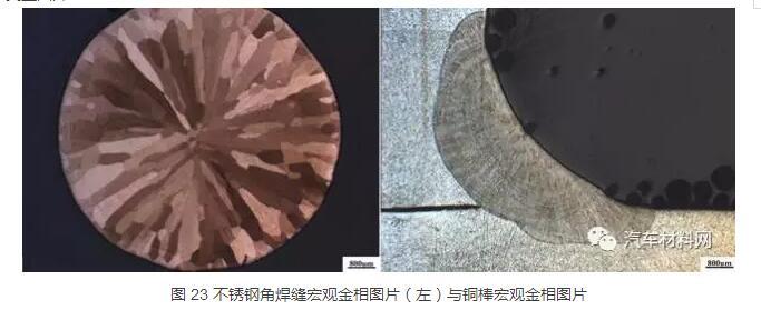 图 23 不锈钢角焊缝宏观金相图片(左)与铜棒宏观金相图片