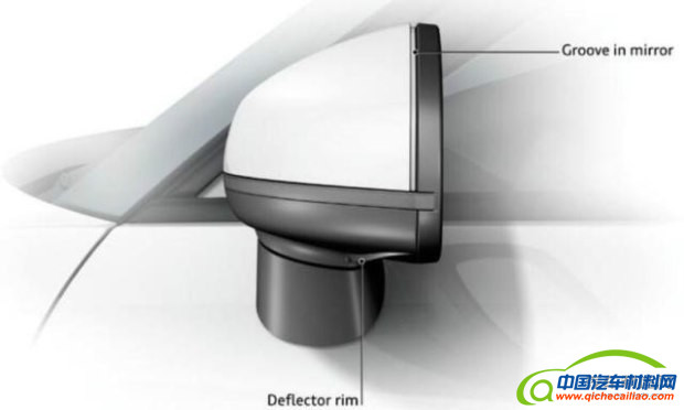 在奥迪A1上同样对后视镜进行了气动和声学的优化。除了对后视镜基本形状优化外,在镜面和盖之间的凹槽可使得雨天后视镜上的水流向外流动,避免遮挡镜面。同时在底部的导向板也可以起到阻挡水滴,流向门窗玻璃和门把手上的作用。