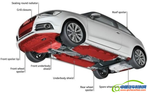 在奥迪A1上除了配备了前扰流板、前护板和车底护板减小气动阻力外,还在车底备胎位置设计了扰流器(下图中标注7的位置),这对减小气动阻力是非常有效的,尤其是对于两厢车。