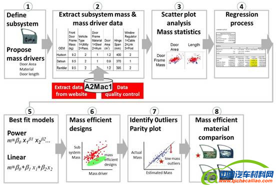 本研究采用的方法与汽车质量基准一致由密歇根大学联合知名汽车benchmark数据公司A2MAC1。本项研究是基于统计学原理,开展整车各系统及零部件的重量状态分析,分析内容包括用材、尺寸,重量平均和标准偏差等,在利用回归分析方法建立重量与相关因变量的关系,用以指导汽车产品的轻量化设计及重量目标的定义、轻量化潜力分析等等。下图为该方法的流程图。